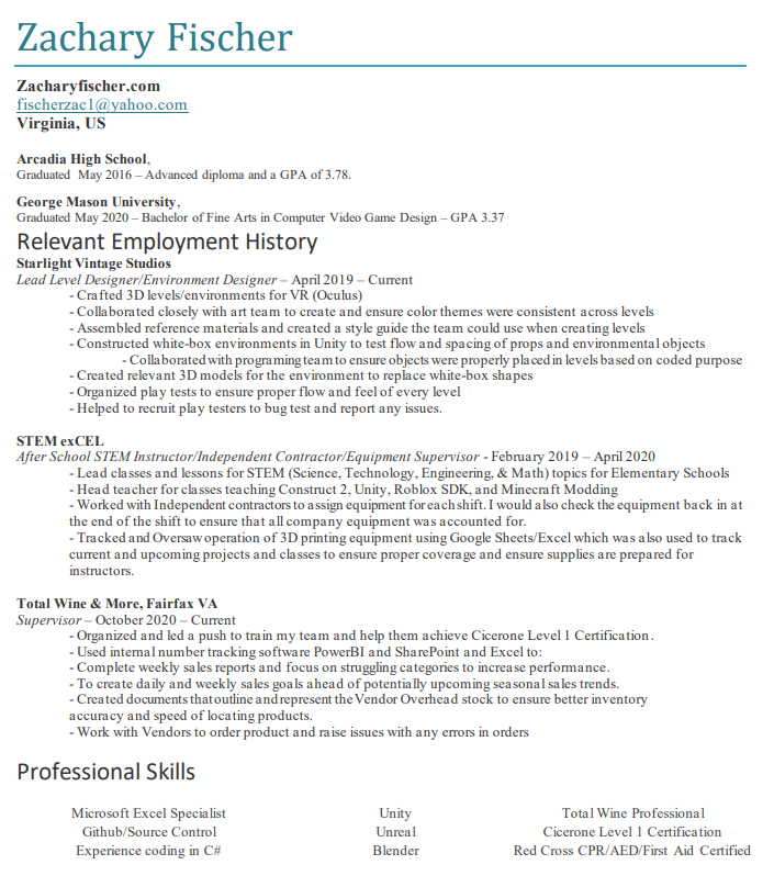 I graduated from George Mason University with a Bachelors in Game Design, and am an aspiring level and environment designer with experience in Unity and Unreal Engine. Since 2005 I have been drawing and designing video game levels and environments and have continued to develop ideas and the skills needed to bring these levels to life.